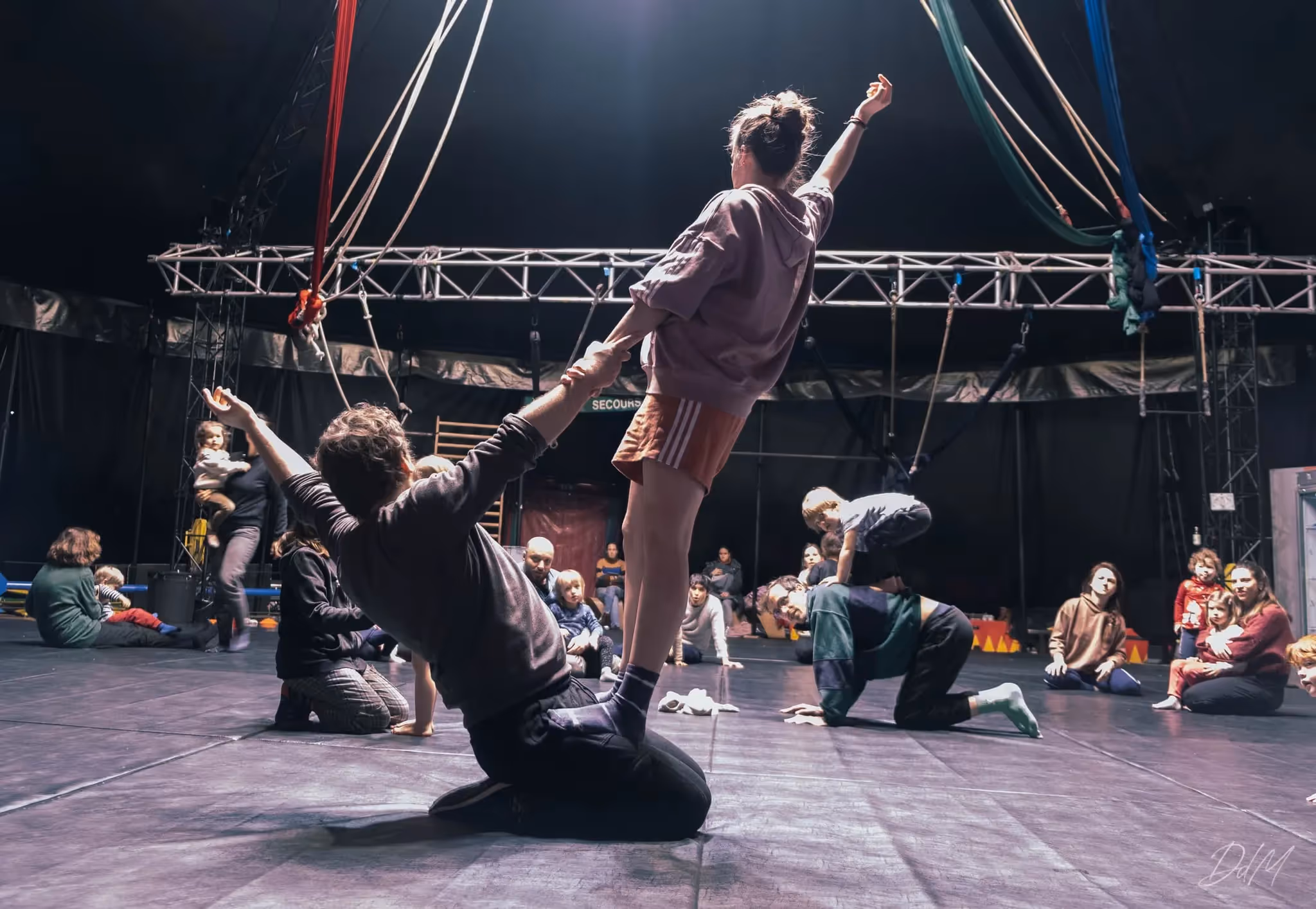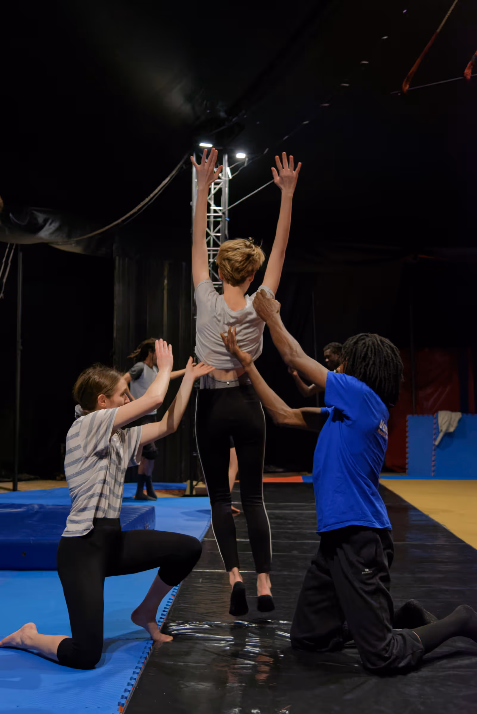 Pour les plus grand·es, stages intensifs et ateliers thématiques permettent d'approfondir les techniques circassiennes et de préparer un numéro collectif.
