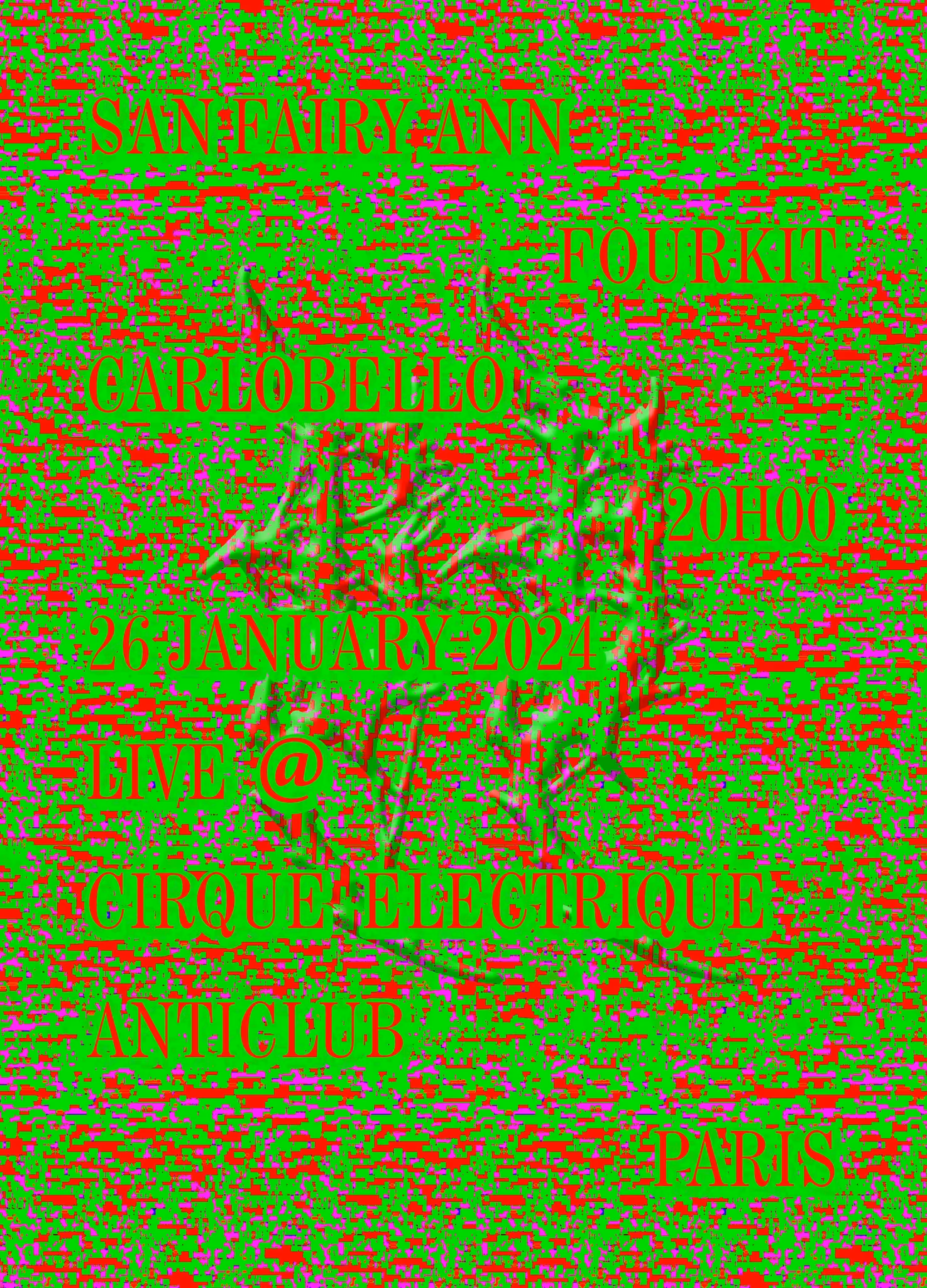 Plateau de folie avec trois des groupes les plus cool de la scène underground parisienneSAN FAIRY ANN:San Fairy Ann est un groupe de rock indépendant qui s’épanouit grâce à des influences britanniques englobant le rock, le trip-hop, la soul et les genres électroniques. Leur musique émouvante sert de récit captivant des tourments intérieurs et des voyages transformatifs que nous rencontrons.FOURKIT:Non content d’arborer un akita pour mascotte, Fourkit – Alex, Gala, Quentin, Thomas, Nicolas et Florian, endosse également des qualités canines:Fidélité envers les maîtres maîtres de l’electro UK, (Warp, Ninja Tune), béatitude innocente à jouer avec les beat trap et hip hop (kaytranada, brainfeeder), ainsi qu’une appétence toute particulière pour les nouvelles croquettes de la scène jazz qui tabasse – (Daïda, KNOWER).Entre épais murs de synthé et rythmique incisive, la ligne de trompette réverberée s’élève tel le Frisbee coursé par un golden retriever sous exta.Florian Bonnin: trompette; Thomas Gachod: guitare; Quentin Zanoli: synthétiseurs; Alexis Lebeau: basse; Nicolas Coste: batterie.CARLOBELLO:C A R L O B E L L O, groupe comète, apparait de nulle part sur la scène musicale de Paris en se laissant derrière une queue multicolore. Le groupe touche à plusieurs canons de l’undergroud: son esthétique punk, sa sensibilité indie rock, ses grooves laid back et sa musicalité débordante en font un animal rare. Aussi flamboyants que spirituels, ces quatres freaks engendrent un spectacle bouleversant ou les rhythmiques monumentales se brisent contre des riffs pétillants; la vaporwave se mélange avec le jungle, le lofi hip hop avec le rock, dans un nouage envirant rose et vert aux effets hallucinogènes.Guitar/Voix: Antonino ElagabaloVibraphone/synthe: Lucas Cord’hommeB(ad)ass: Marius OrjolletDrums/Drum machines: Nicolas Coste