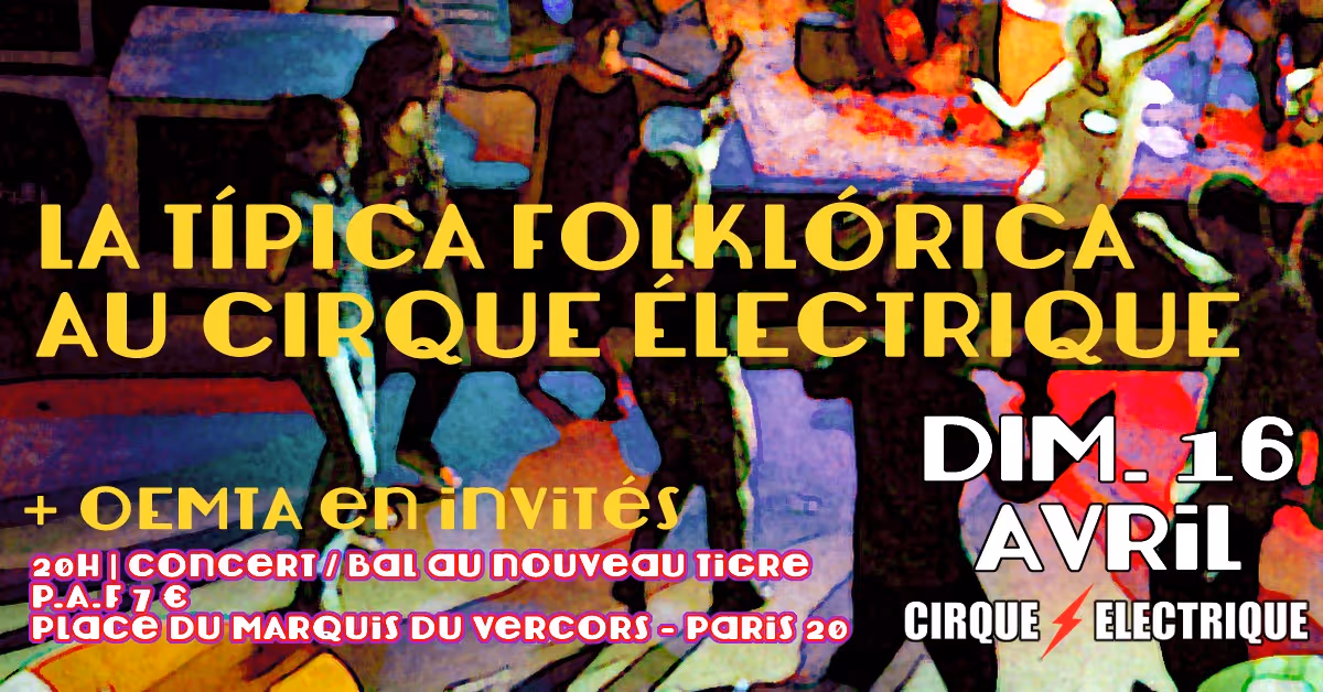 3ème Peña de folklore argentin accompagné de La Típica Folklórica et l’Orchestre Ecole de Musiques Traditionnelles Argentine (OEMTA www.oemta.fr )Venez danser la Chacarera, la Zamba, la Cueca (et bien d’autres choses!) sous le parquet de bal du Nouveau Tigre, ou simplement profiter des savants arrangements musicaux de cette formation typique et atypique!C O N C E R T / B A L20h – Concert/Bal de la Típica Folklórica + OEMTAAvec : Alfonso Pacin (direction musicale, arrangements, guitare, percussion et chant) – Marie-Anne Faupin (bandonéon, flûte) – Alexandre Peigné (bandonéon) – Anne Mazeau (piano) – Weronika Rychlik, Elsa Sissia, Caroline Pearsall, Inocente Carreño, Guillaume Antonini (violons) – Romain Lecuyer ou Santiago Quagliariello (contrebasse)