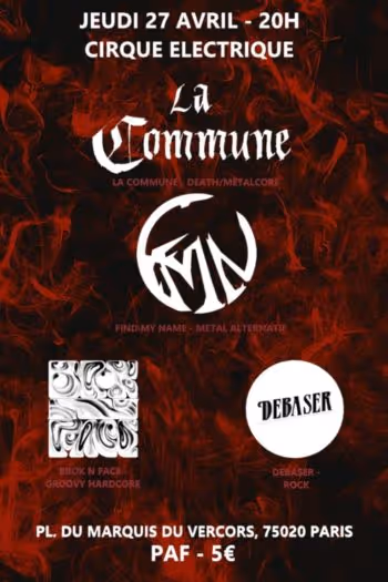 LA COMMUNE (Death/Metalcore)FIND MY NAME (Metal alternatif)BROK N FACE (Groovy Hardcore)DEBASER (Rock)
