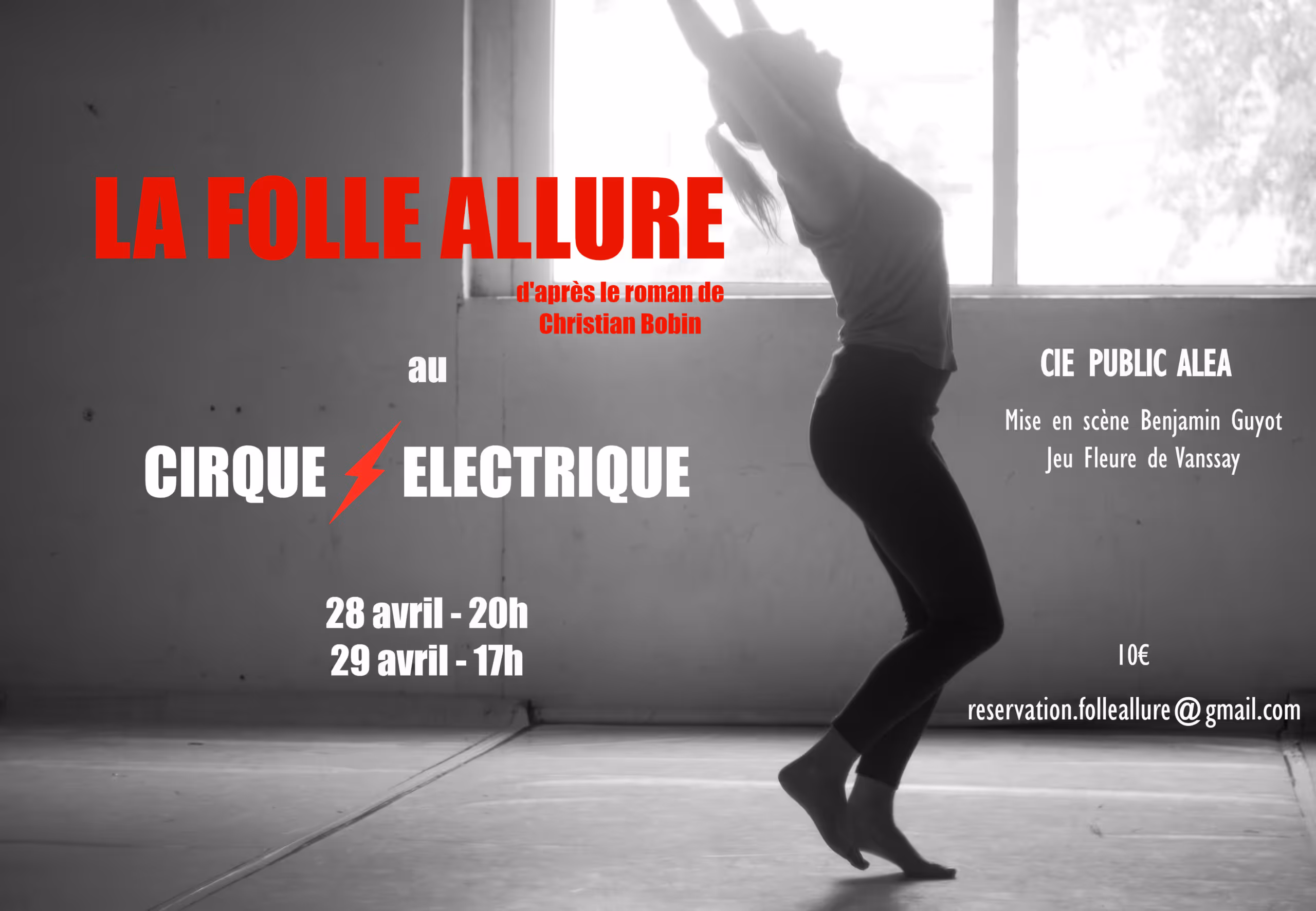 LA FOLLE ALLURECIE PUBLIC ALEAUne jeune femme s’arrête pour un temps dans un hôtel du Jura, afin de mettre sa vie sur papier. Et nous raconter sa course folle et amoureuse à travers l’existence. Du cirque de son enfance à la vie parisienne en passant par la cité de Créteil, chaque expérience est pour elle synonyme d’aventure.Une fuite en avant pour célébrer la liberté d’être et d’aimer..D’après le roman de Christian Bobin, publié aux Editions Gallimardadaptation, décors Benjamin Guyot, Fleure de Vanssaymise en scène Benjamin Guyotlumières Anna Genestejeu Fleure de VanssayProduction Compagnie PUBLIC ALEA