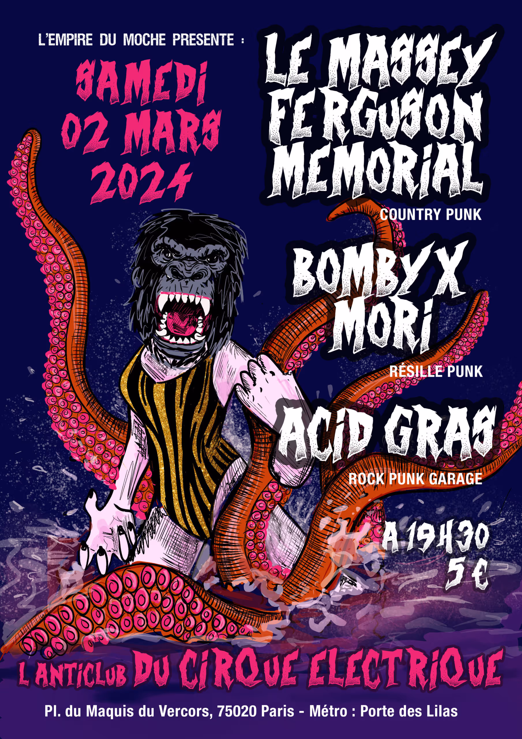 — L’Empire du Moche présente — SA FOSSE AUX LIONNES #3Avec Bombyx Mori – Resilles Punk’n’rollhttps://www.facebook.com/thebombyxmori Acid Gras – Rock Punk Garagehttps://www.facebook.com/acidgras/ Le Massey Ferguson Memorial – Country Punkhttps://www.facebook.com/p/LE-MASSEY-FERGUSON-MEMORIAL-100063208029983/5€
