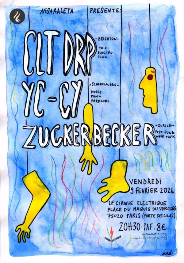CLT DRP (Brighton, UK) – trio electro-punkhttps://cltdrp.bandcamp.comhttps://youtu.be/AyYK0wjsaG8https://youtu.be/mFLLM4LLUEwhttps://youtu.be/LqMa-vyEQsI__________________________________________YC-CY (Schaffhausen, Suisse) – noise punk hardcorehttps://yc-cy.bandcamp.comhttps://youtu.be/tUEjmo2VrhUhttps://youtu.be/cLVA8fy2NzM__________________________________________ZUCKERBECKER (Zurich, Suisse) – post punk / wave punkhttps://zuckerbecker.bandcamp.com