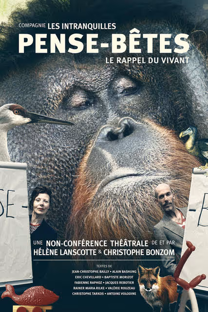 Compagnie Les IntranquillesPENSE-BÊTES, LE RAPPEL DU VIVANTUne non-conférence théâtrale de et par Hélène Lanscotte et Christophe Bonzom.Dans la famille Animal, je réclame le Sauvage vivant, toutes les espèces, tous les genres et pas seulement le cousin proche. Depuis toujours, j’ai besoin de l’animal, de l’animal vivant.Loin des yeux, loin du cœur ; le citadin mondialisé, ne croisant plus beaucoup d’animaux, ne se soucie guère de la disparition de ces invisibles.Nous rappeler le vivant, notre attention au vivant, tel est le souhait de ce Pense-Bêtes. Un rappel du vivant que nous avons choisi d’effeuiller avec sérieux, tendresse, humour, inquiétude, grâce aux réflexions et fictions de littérateurs, scientifiques et poètes.Textes de Jean-Christophe Bailly, Eric Chevillard, Baptiste Morizot, Fabienne Raphoz, Jacques Rebotier, Rainer Maria Rilke, Valérie Rouzeau, Christophe Tarkos et Antoine Volodine.Emprunts musicaux à Alain Bashung, Philippe Katerine et Steve Reich.Vendredi 21 juillet 2023 à 20h