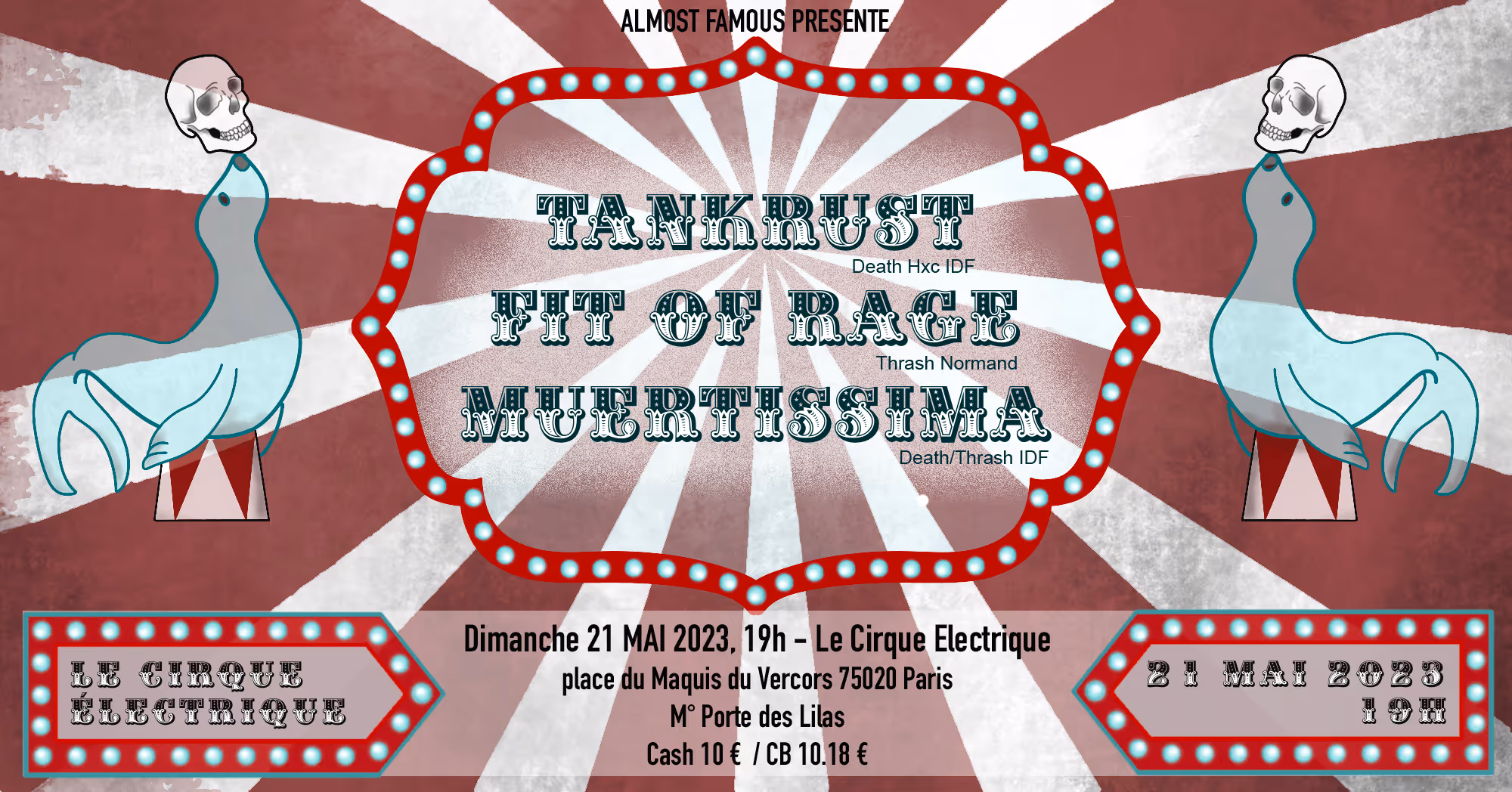 Almost Famous présente :TankrusT (Death/Hxc – IDF) – écouterLes piliers parisiens du genre n’ont pas épuisé leur énergie et délivrent une nouvelle fois leur musique hybride si intense et célèbre pour ses lives dantesques.Le quintet vient tester ce soir quelques morceaux de son futur album, en avant-première !– Fit Of Rage (Thrash – Normandie) – écouterAbrasif et infatigables, voici les patrons de la scène normande qui pour une fois exceptionnelle apportent leurs riffs rageux à Paris.Un capital sympathie énorme et une musique qui anime le corps du feu de son rythme. Immanquable !– Muertissima (Death – IDF) – écouterMétéore montant du death, Muertissima impose rapidement son gabarit musical fondé sur les pontes du genre qu’il remet au goût du jour.Sans prise de tête mais avec talent, le groupe déroule des lives qui rendent violemment heureux et dont on parlera encore longtemps !