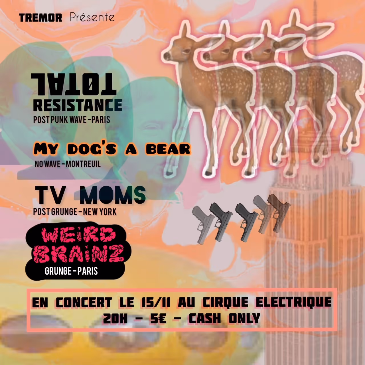 TREMOR présente :MY DOG’S A BEAR (Post punk de pleine lune, almost no wave) – écouterTOTAL RESISTANCE (Coldwave survitaminée) – écouterWEIRD BRAINZ (Grunge, Paris) – écouterTV MOMS (Post grunge de NY) – écouter
