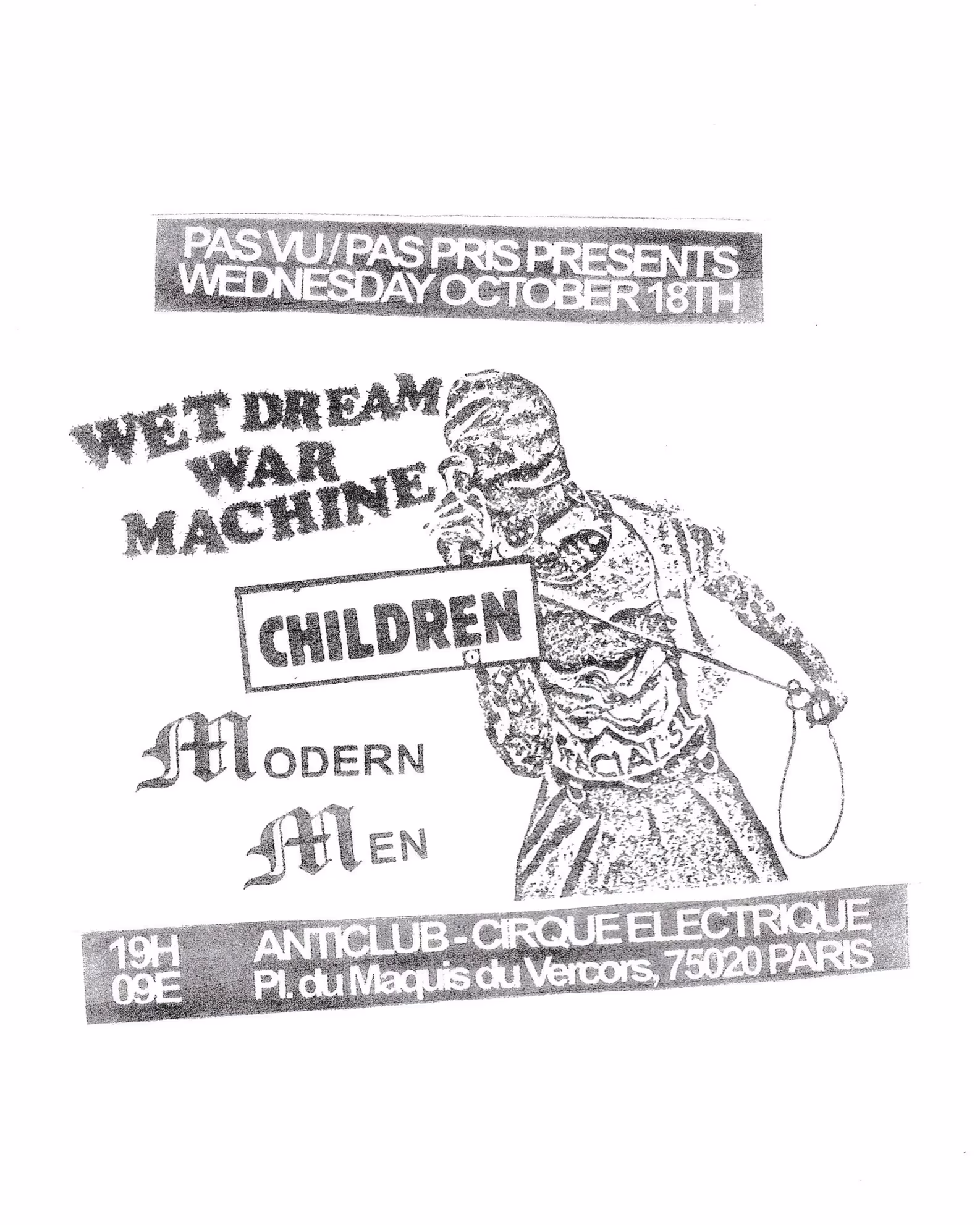 PAS VU / PAS PRIS présente :WET DREAM WAR MACHINE (Punk hardcore, DE) – écouterCHILDREN ( Noise rock expé, DE) – écouterMODERN MEN – Facebook