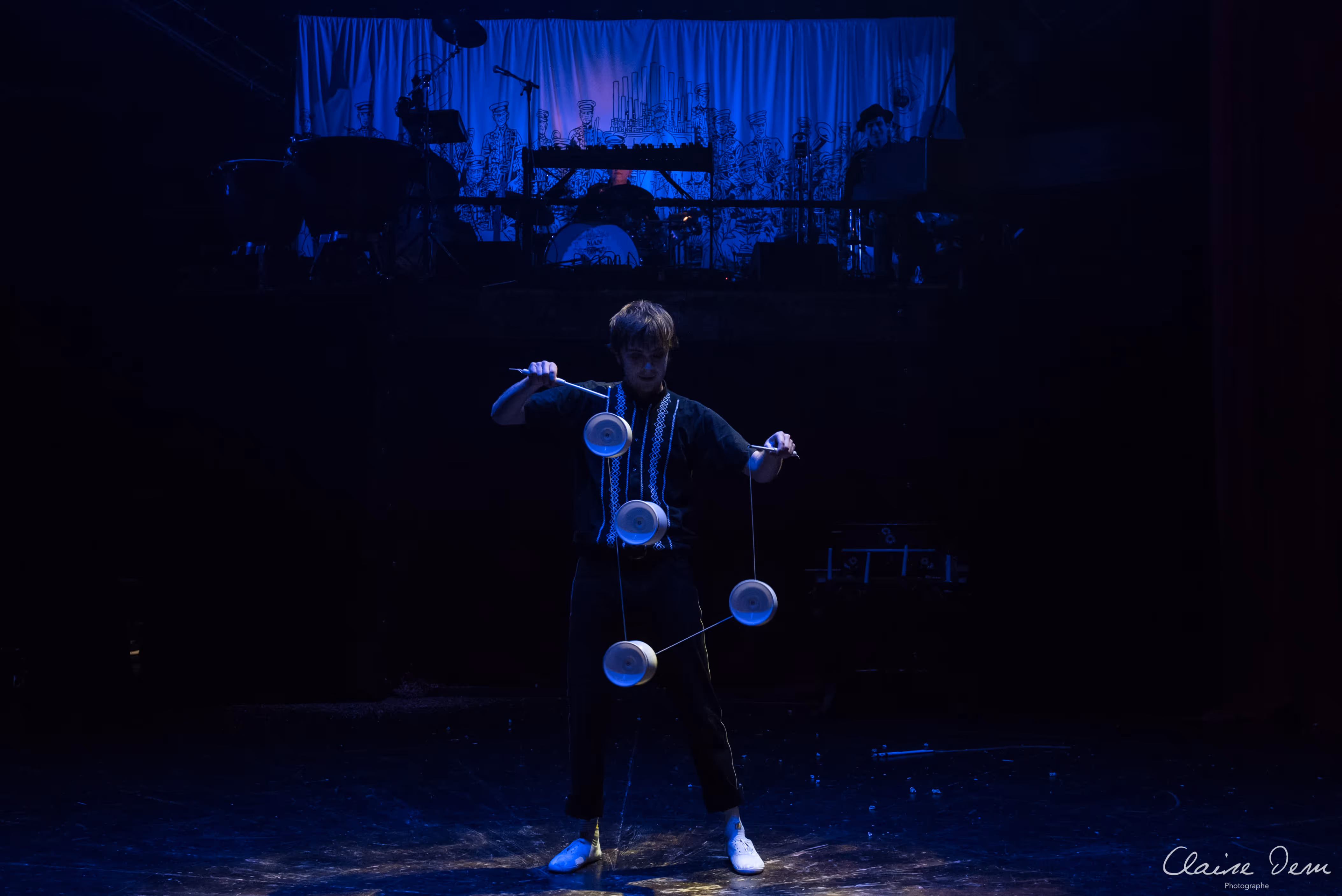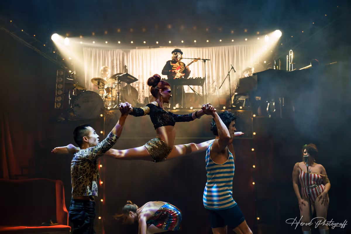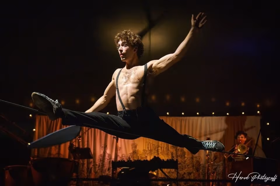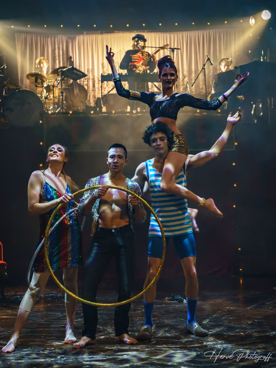 Fanfare revisite les fondamentaux du cirque : piste en 360°, numéros de cirque et de music-hall qui se succèdent, du trapèze à l’acrobatie,de l’équilibre à la bouffonnerie, de la banquine au jonglage des idées, faussecomédie musicale, claquettes et danses arythmiques, cartoons et musique dedessin-animé, orchestre perché, clowns et fanfaronnade, pop-corn et cotillons, aucunfil conducteur, pas une narration mais des narrations, crètes et pâquerettes, tarte à lacrème, une naïveté assumée.