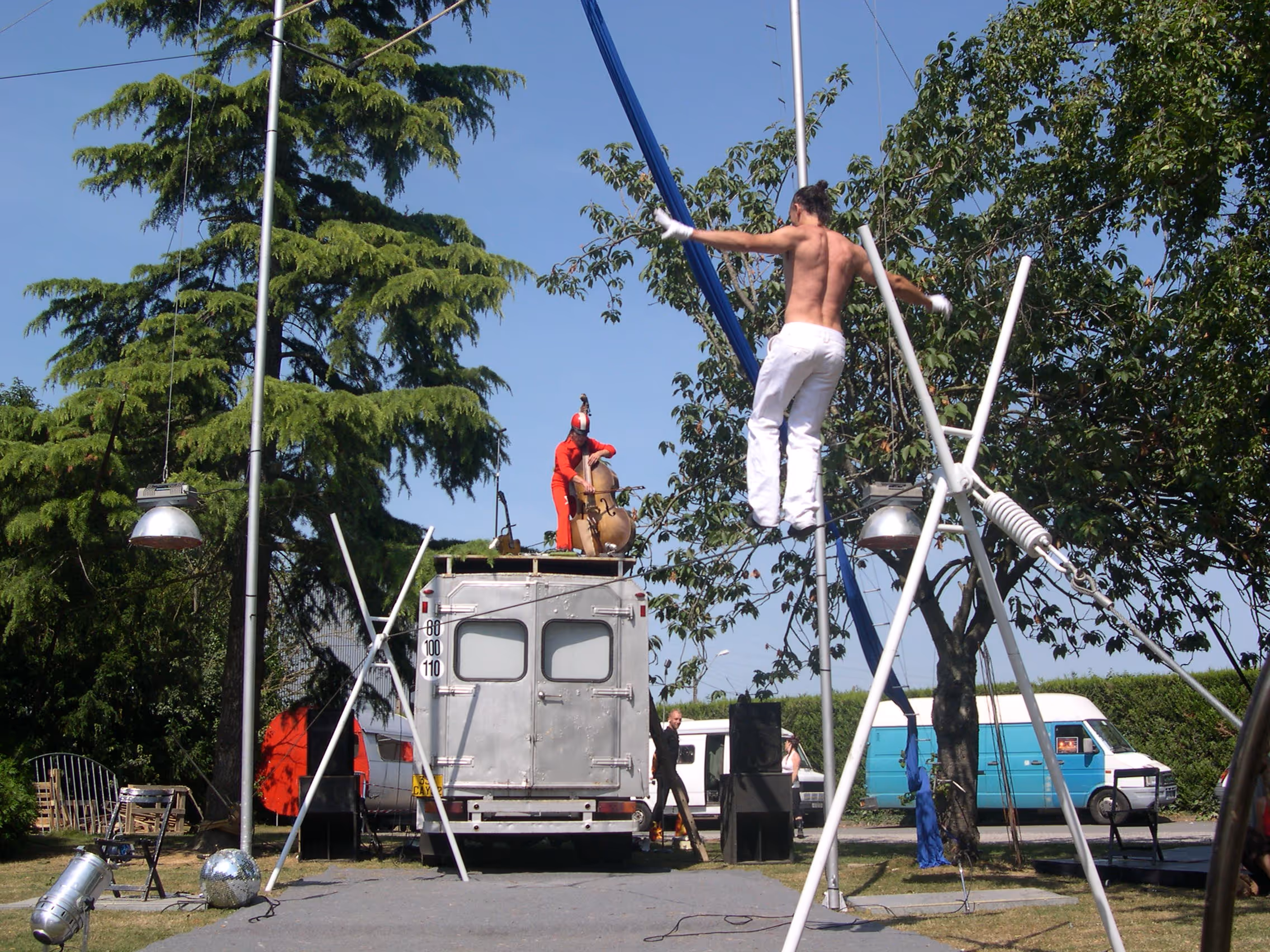 Spectacle de rue sur portique, Passengers, comme THE GREAT MOTEUR SHOW III, évoque l’errance, les grands espaces, la route.